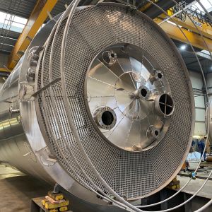 In januari 2021 hebben we een nieuwe RVS opslagtank geleverd in Terneuzen. De tank van 125m3 is in onze werkplaats voorzien van een isolatie, kooilader en bordes en is per as naar Terneuzen vervoerd. De tank is ∅4m en totaal 11,0m hoog.